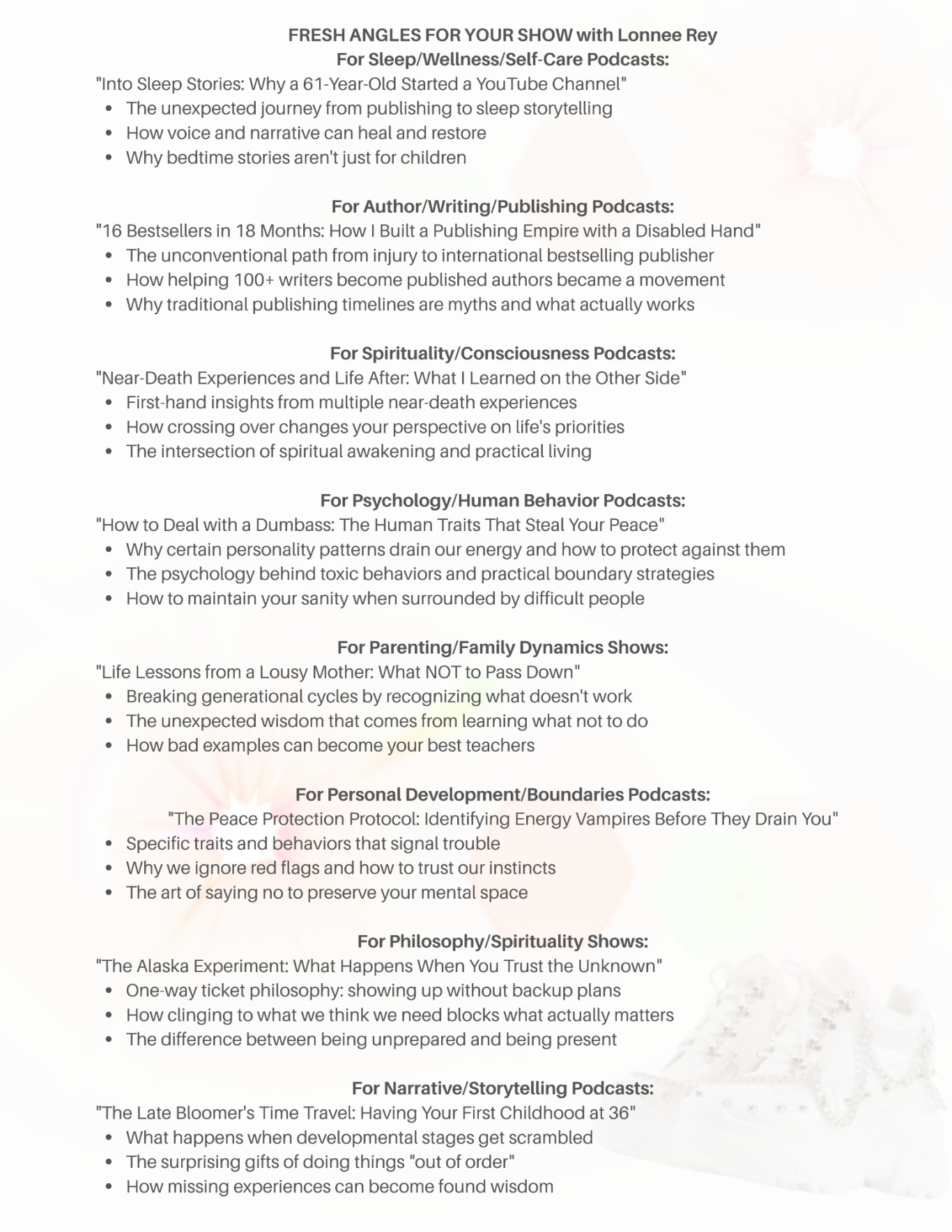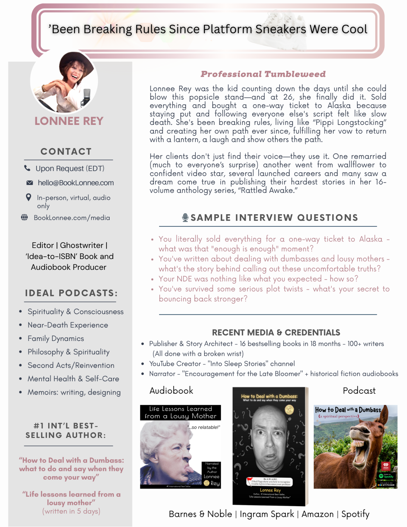 At 62-going-on-35, 9x podcast host, Lonnee Rey, has explored more arenas than a rodeo clown—and lived to tell about it with wisdom, humor, and surprising insights. As a best-selling publisher and story architect, she helps late bloomers turn their life experiences into powerful visibility tools.